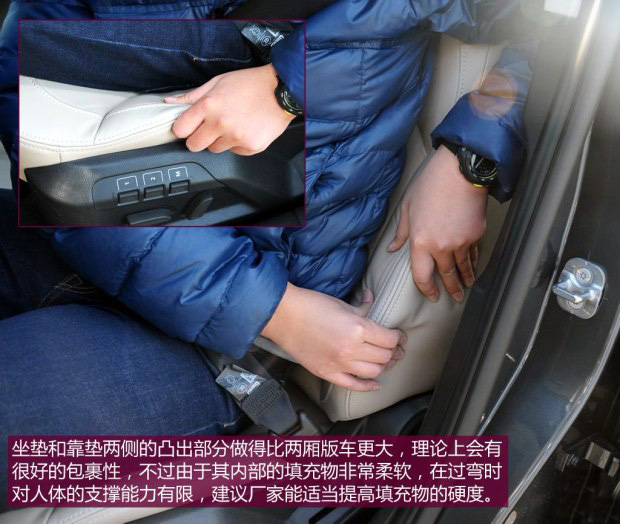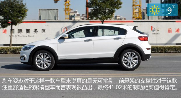 新車的懸架系統經過了“加高”,增加了約25mm,再加上使用了直徑更大的車輪,都市SUV比觀致3兩廂版高出了59mm。如果說先期上市的兩款觀致3的懸架系統硬得有點像坐在老式帶螺旋彈簧的席夢思上一樣的話,那么都市SUV的懸架就像是在這層床墊上再鋪上一層海綿。
