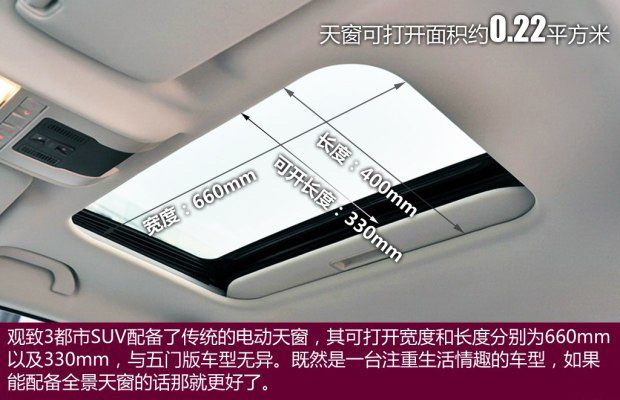 這款都市SUV也僅配備了普通的電動天窗,天窗最大打開面積為0.22平方米,在尺寸上并不算搶眼,只能說是能夠滿足基本的使用需要而已。此前的概念車上雖然配備了全景玻璃車頂,但是考慮到實用性,這種配置目前暫沒有量產的計劃。