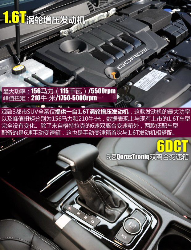 觀致3都市SUV全系搭載的是一臺1.6T渦輪增壓發動機,其最大功率和峰值扭矩分別為156馬力和210牛·米,在數據表現上與觀致3的其他幾款配備1.6T發動機的車型并沒有區別。與之搭配的6速雙離合變速箱由格特拉克提供,在觀致3的其他車型上也能見到。