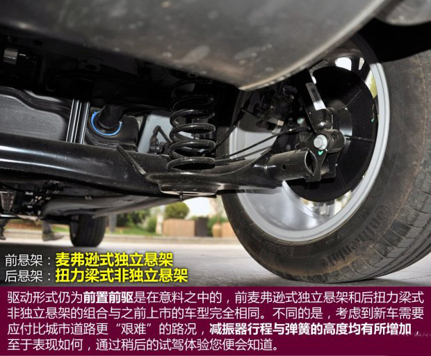 而在底盤懸架方面,仍然采用前輪驅動的形式我們并不感到意外,前麥弗遜式獨立懸架后扭力梁式非獨立懸架的配置與先期上市的幾款車型其實并沒有區別。不同的是,為了能夠適應更惡劣的路況需要,減振器和減振彈簧做了一些調整,不僅行程更長,減振器也調校得更注重舒適性。