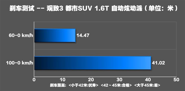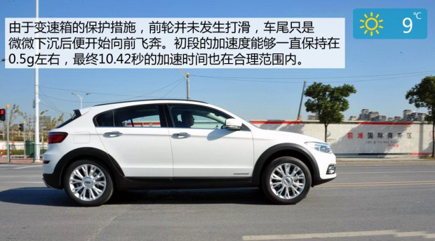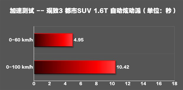 由于受到雙離合變速箱的保護,觀致3都市SUV 1.6T的起步走的是“穩扎穩打”的路線。盡管懸架為偏向舒適的調校,但是車尾僅是微微下沉,車輛便向前飛奔而去。在起步的前三秒,車輛的加速度能夠一直保持在0.5g左右,隨著車速的逐漸升高,加速腳步不斷放緩。在整個加速過程中,變速箱幾乎沒有任何頓挫,最終10.42秒的實測成績比官方公布的10.8秒要好上不少。