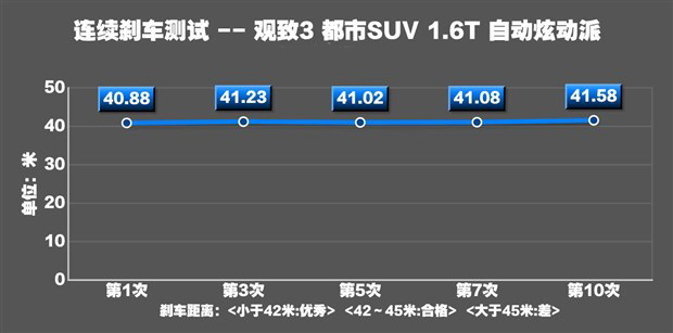 前后盤式制動器讓剎車時的減速度位置在-1g左右,制動時的輪胎都能牢牢地抓住地面,前懸架的壓縮長度也不大,支撐性相當不錯,最終我們實測的剎車距離為41.02米。