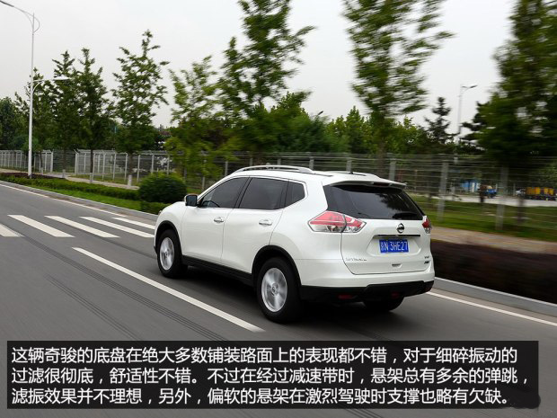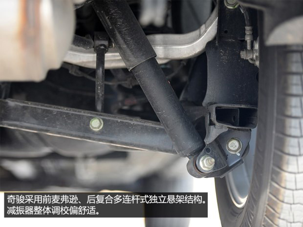 這臺奇駿采用了前麥弗遜、后多連桿獨立懸架結構,整體調校偏舒適風格,底盤在大部分鋪裝路面的表現都讓人滿意,對于細碎振動的過濾徹底,跑高速時也足夠扎實。不過,在經過類似減速帶等較大顛簸時,由于減振器阻尼偏弱,彈簧會出現一些多余的彈跳,給人的感覺不是太好。在高速轉彎時,車身又會有較明顯的側傾,當然,對于不屬于運動風格的奇駿而言也在情理之中。