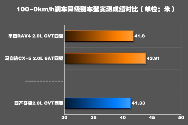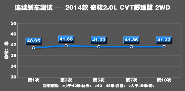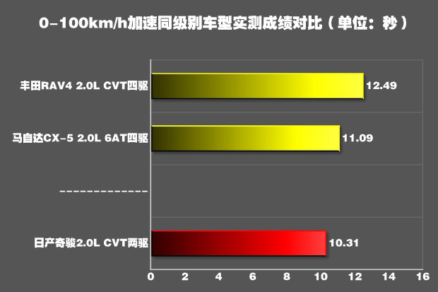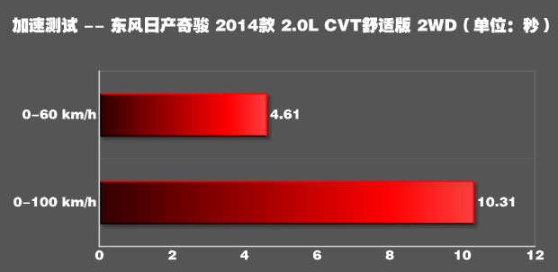 在0-100km/h加速測試中,這臺2.0L奇駿用10.31秒的成績向我們證明了它不俗的加速能力,當然,這個成績只是和同級對手相比。起步時,變速箱會將轉速限制在2600rpm左右,此時開不開VDC車輛穩定控制系統都是一樣的。松開剎車,前輪會有輕微打滑,隨后車輛開始加速。在整個加速過程中,我們能夠感受到,1擋切入2擋時,轉速干脆利落地從6000rpm降至5000rpm,但2擋升3擋時則顯得有些猶豫,而且轉速一下從6000rpm回落至4700rpm左右,稍稍造成了一點動力損失,否則加速會更快一些。
