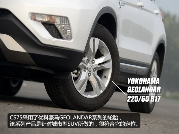 CS75采用了優(yōu)科豪馬GEOLANDAR系列的輪胎,該系列產(chǎn)品是針對城市型SUV所做的。CS75的輪胎規(guī)格為225/65 R17,并且該規(guī)格的輪胎為全系標(biāo)配。全尺寸的備胎對于自主品牌來說,已經(jīng)是件很常見的事兒了,但對于廠家這種厚道的表現(xiàn),還是要認(rèn)可一下,與其它輪胎不同的是備胎采用了鋼制輪圈。