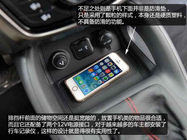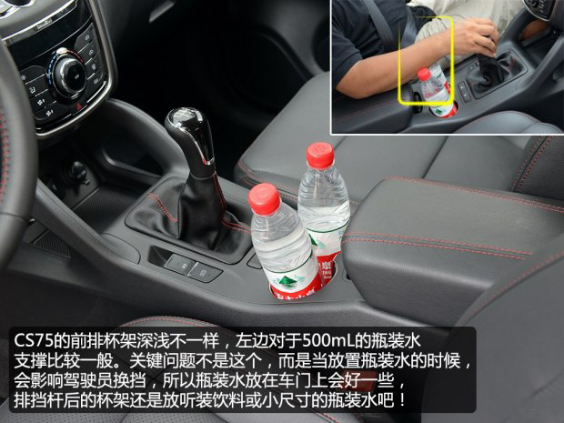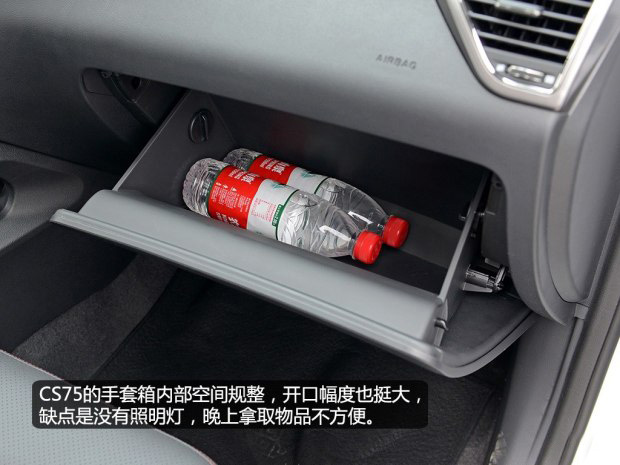 CS75的手套箱空間夠?qū)挸ǎ依锩嬉埠芤?guī)整,但沒有照明燈,在夜晚使用時會感覺不夠方便。中控臺下方的儲物空間夠大,拿取物品很方便。不足之處就是杯架的設(shè)計,兩個杯架里面的高低設(shè)計不一樣,靠近駕駛員一側(cè)的杯架相對較淺,對水瓶的支撐要差一點。這還不是最重要的,關(guān)鍵是當(dāng)放置500mL的瓶裝水時,會影響換擋,手臂剛好會碰到水瓶,感受不是很好。所以,這里的杯架,我們還是建議放置較小的瓶裝水或者聽裝飲料。