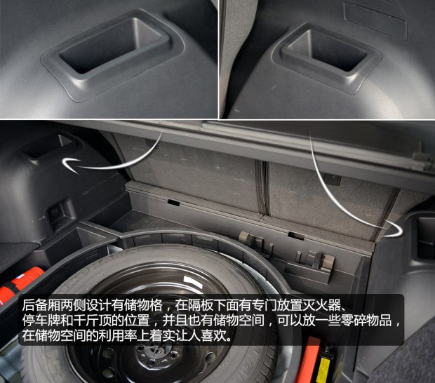 在后備廂隔板下面,有一些小的儲物格,還為滅火器設(shè)計了專用位置,細節(jié)表現(xiàn)做的非常好,日常使用中,很多小的零碎物品不用擔(dān)心散落在后備廂里了。