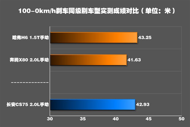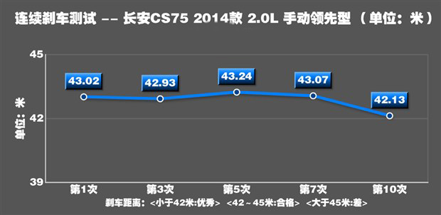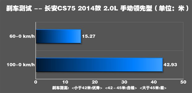 在剎車測試中,CS75的懸架對于車身的支撐表現(xiàn)出色,懸架將車身穩(wěn)穩(wěn)的拉住,并沒有出現(xiàn)過于嚴(yán)重的點頭。最終成績?yōu)?2.93米,離我們認(rèn)為優(yōu)秀的范圍還差了一點點,整體表現(xiàn)中規(guī)中矩。