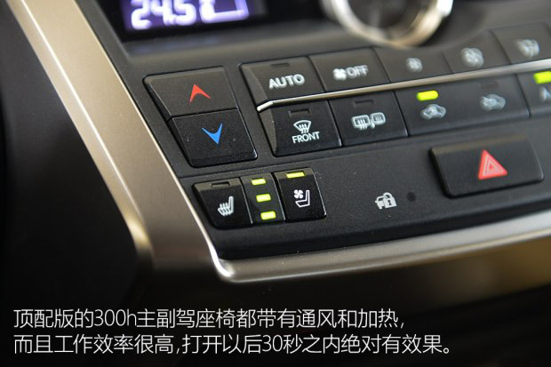 NX 300h的車里依然是熟悉的雷克薩斯氛圍,飄著一股豪華車的味兒,中控設計得很有立體感,功能按鍵用起來很順手。我比較喜歡的配置有座椅通風/加熱、HUD抬頭顯示、智能遠光燈等等,而朋友和家人更青睞這個全景天窗。說實話,這個配置確實能給車內帶來不錯的通透感,但并不能上掀透氣,希望小改款后增加前部打開功能。