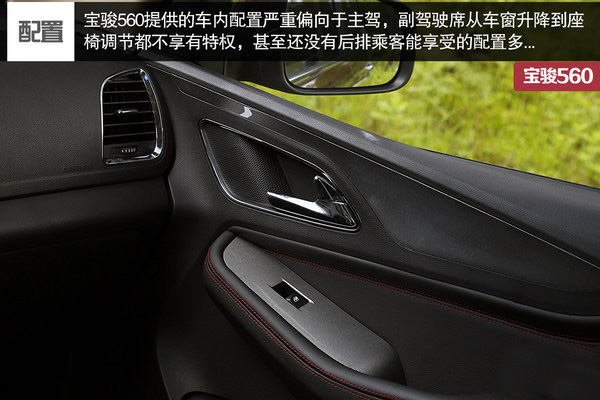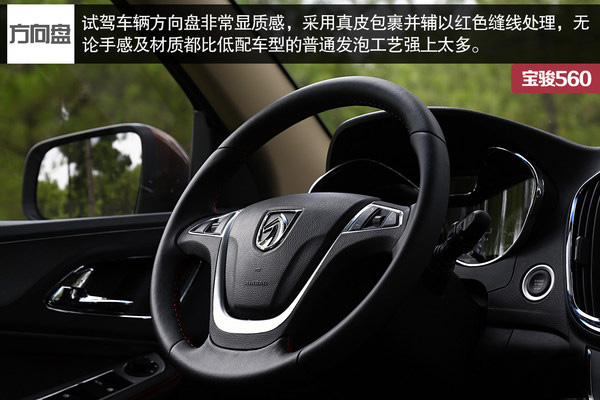 寶駿560內飾造型沒必要再做解讀,不過對于全黑內飾,幾處鍍鉻裝飾運用值得贊揚,提升質感同時不喧賓奪主。雖然中控用料基本為硬塑料,但最上層應用了一層軟性材質,試駕車輛方向盤非常顯質感,采用真皮包裹并輔以紅色縫線處理,無論手感及材質都比低配車型的普通發泡工藝強上太多。
