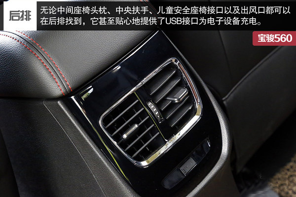 560后排具備很多看點,首先后排空間通過下圖展示便無需再多解釋,完全是越級表現。無論中間座椅頭枕、中央扶手、兒童安全座椅接口以及出風口都可以在后排找到,它甚至貼心地提供了USB接口為電子設備充電。此外560后排中間位置十分平整,并且縱向距離充裕,即便身材高大在后排中間位置也不會“折扣”舒適性。