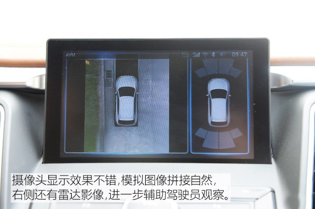 DX7手動尊貴型的后視鏡上帶有兩種攝像頭,一種是用來輔助倒車的全景攝像頭,一種是并線輔助攝像頭,整體顯示效果都很不錯,分辨率與對比度令人滿意,兩種攝像頭都可以手動開啟,有效防止停車刮蹭。
