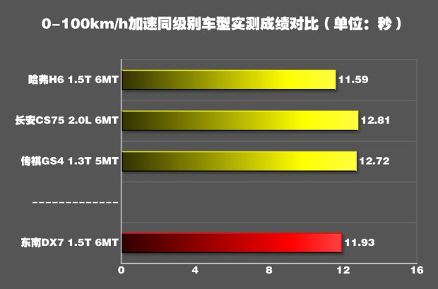 東南DX7在起步時車輪沒有什么打滑,車頭有一些上揚,這和它行程偏長的懸架系統(tǒng)不無關系。1擋時加速度基本能保持在0.5g,還不錯,換擋2擋后轉速掉的比較多,加速度也迅速回落,需要時間再把速度提上去。前文中我們也提到了,這臺6擋手動變速箱齒比設定稀疏,勢必會對加速有影響。最終成績11.93秒,屬于這個級別車型的正常水平。