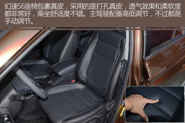 幻速S6座椅包裹真皮,采用的是打孔真皮,透氣效果和柔軟度都非常好,乘坐舒適度不錯。主駕駛配備高低調節,不過都是手動調節。