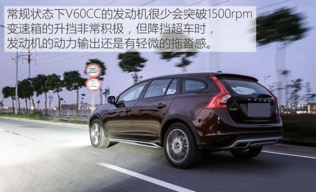 常規狀態下駕駛V60CC,發動機的轉速很少會突破1500rpm,變速箱的升擋非常積極,而若是有超車的打算,其降擋的反饋也僅在腳踝輕移的轉瞬之間。2.5L的動力對V60CC來說肯定夠用,更何況還帶有渦輪增壓,所以動力肯定不是問題,只是從降擋時的1400rpm陡然上升至最大扭矩轉速1900rpm的這段時間里,你會略微的感覺到動力的拖沓,需要一些時間去適應。相比之下,2.0T Drive-E低功率發動機在1300rpm就可以達到最大扭矩,而高功率版本也僅僅為1500rpm,動力的響應還是要比這臺五缸2.5T發動機快一些。