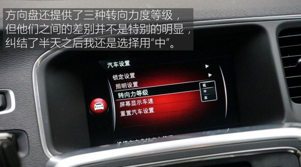 沃爾沃的三輻方向盤手感非常好,不過這只是代表著硬件本身的物理手感,而實際開起來,對手感的理解和喜好就因人而異了。V60CC和之前試駕過的S60L,甚至是和大部分沃爾沃的車型一樣粘手,回饋的力度雖然在系統中可以調節,但三個擋位間的差異并不明顯。我更偏重于選擇原廠的“中”,因為無論“低”還是“高”,要不就是手感飄忽,要不就是變得更粘手。