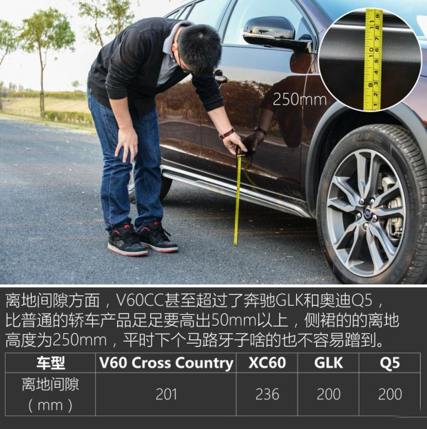 當然還別忘記了,眼前的這臺V60CC還帶有四驅系統、很大的接近角和離去角,當然還有我們重復了無數次的離地間隙,所以你可以大膽的開著它去下工地、簡單的OFFROAD或者在泥濘的道路上大膽的前行。這是V60CC的另一大優勢,某種程度上來說,它的通過性并不輸于GLK和Q5,但公路行駛能力上卻有明顯的優勢,這就是V60CC存在的意義。