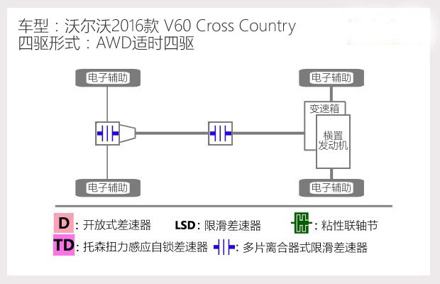 從四驅結構上來看,V60CC的AWD全時四驅系統中央為多片離合器式限滑差速器,負責前后軸的動力分配,正常行駛時,前、后軸按照95%:5%動力分配;急加速時則給予每個車輪最高25%的驅動力;而當前輪打滑時,則最多可將50%的動力傳遞到后輪。后橋同樣為多片離合器式限滑差速器,負責左右車輪的動力輸出分配,前輪則為開放式差速器,只能依靠電子限滑來提升通過性,這套四驅系統從結構上來說和XC60是完全一致的,只是由于瀚德公司已被博格華納所收購,所以未來我們只能稱其為博格華納的第五代四驅系統了。