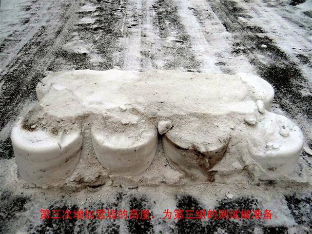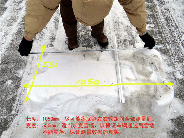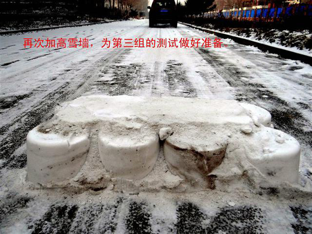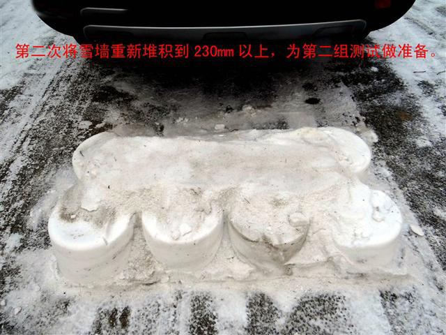首先要將兩側輪胎經過的路面清掃干凈,保證剎車制動的效果和測試數據的準確。用塑料小圓凳子,在測試路面堆積好230mm以上高度的一條積雪墻(雪帶),積雪的寬度盡可能的接近左右兩輪。