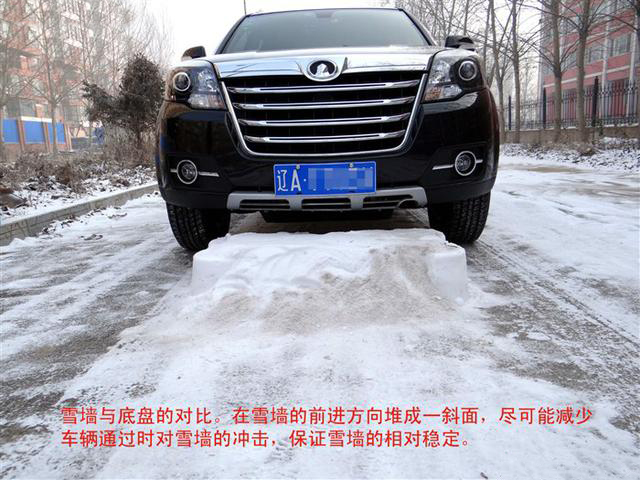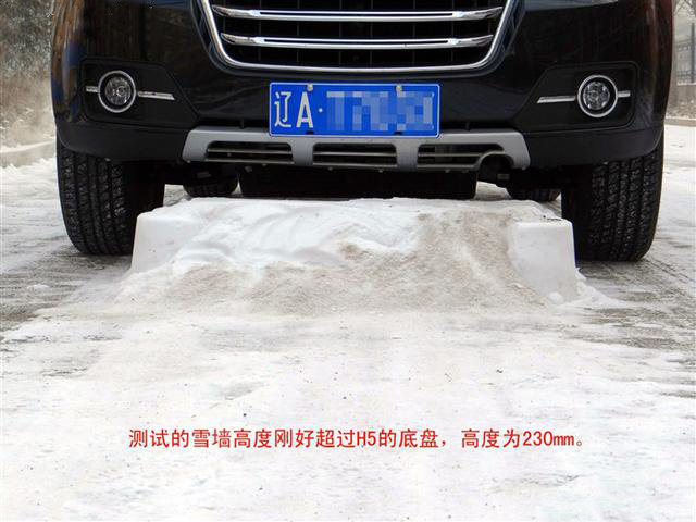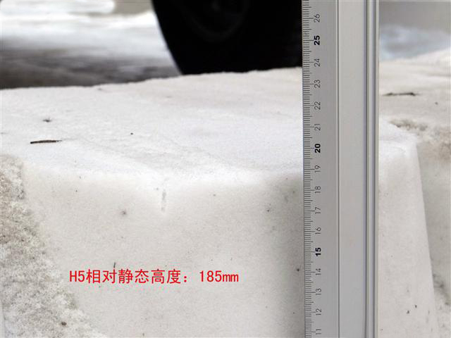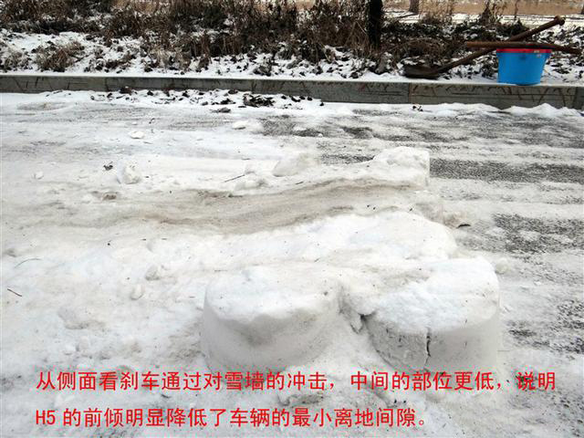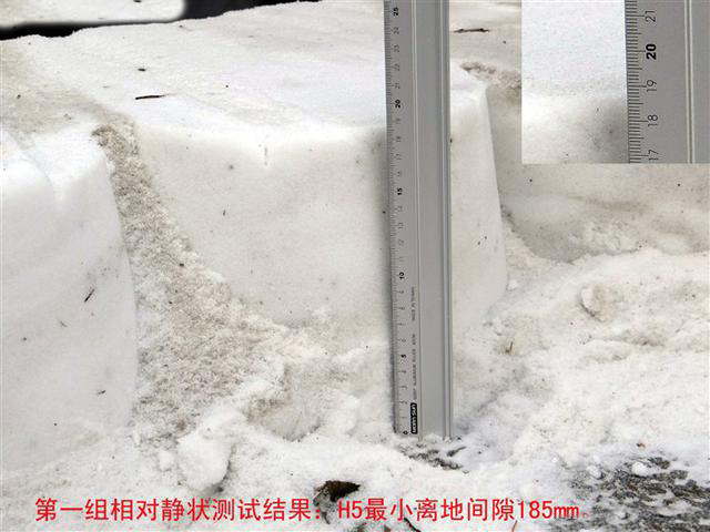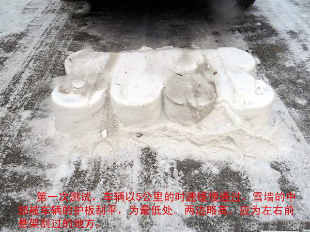 第一組測試:乘員2 名,以5km以下的時速通過雪墻,測試相對靜態的最小離地間隙。從車輛經過后對雪墻削減的情況,你就知道H5的底盤到底什么地方最低了。
