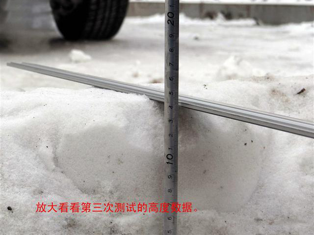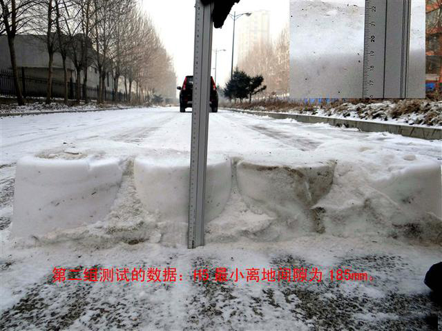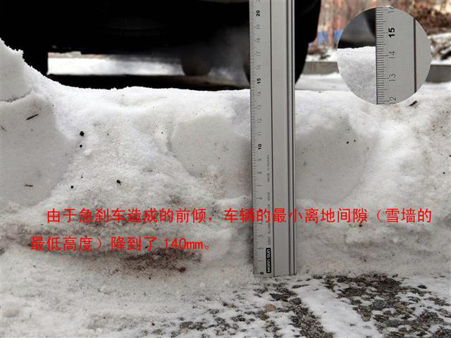 第三組測試:乘員2名,以30km的時速度,距雪墻5米時踩急剎車(造成前傾)通過雪墻,測試剎車時的最小離地間隙。本組只測試了一次,如果再增加兩次數據會更加合理。