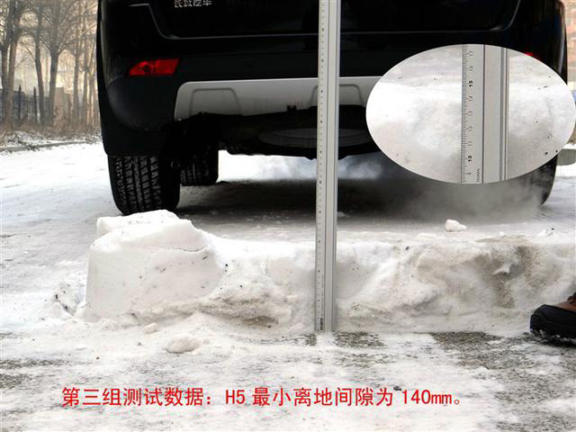 1、測試車輛僅限2013款H5(汽油2.0T四驅),因為這款車前面的中冷裝置要低一些,與柴油車差不多,H3、H5的自然吸氣發動機車輛最小離地間隙要好于它;