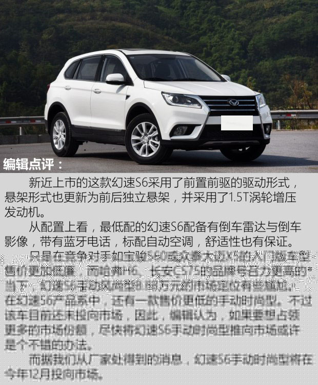 作為眼下“兵家必爭(zhēng)之地”的城市SUV市場(chǎng),誰(shuí)都想分一杯羹。最近北汽幻速就發(fā)布了一款全新的緊湊型SUV——幻速S6。這款車(chē)具有不錯(cuò)的外觀設(shè)計(jì),并且同之前北汽幻速的兩款小型SUV幻速S2和S3不同,采用了前置前驅(qū)的形式?;盟賁6的指導(dǎo)價(jià)為7.98萬(wàn)元至11.68萬(wàn)元,而7.98萬(wàn)元的手動(dòng)時(shí)尚型目前還沒(méi)有生產(chǎn),按照廠家的生產(chǎn)計(jì)劃將在今年12月才會(huì)投放到各4S店。因此8.88萬(wàn)元的手動(dòng)風(fēng)尚型就是幻速S6的目前能買(mǎi)到的入門(mén)級(jí)的車(chē)型了。同它的競(jìng)爭(zhēng)對(duì)手寶駿560或是眾泰大邁X5不到8萬(wàn)的起售價(jià)相比,幻速S6的售價(jià)格似乎有些高,那么這款車(chē)能否對(duì)得起它的價(jià)格呢,我們一起來(lái)看看。