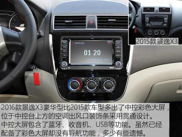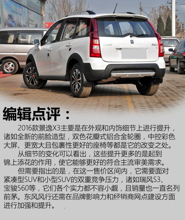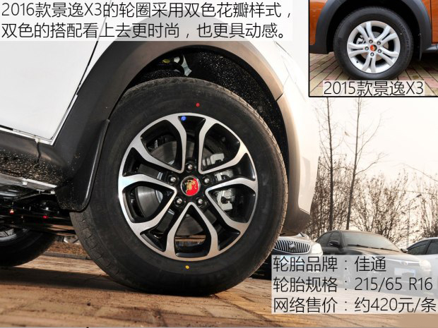 2016款景逸X3的官方指導價格為7.39萬元,目前石家莊地區暫有2000元的現金優惠。其主要增加了倒車影像功能、中控彩色大屏、車內空氣調節等配置,并可選裝無鑰匙進入和一鍵啟動功能。而諸如動力、傳動系統,電動天窗、真皮方向盤等與2015款車型保持一致。配置增加,售價不變,可以看出這是一次誠意的升級。如果您正在考慮購買一款6-7萬元的緊湊型SUV,不妨可以考慮一下景逸X3。