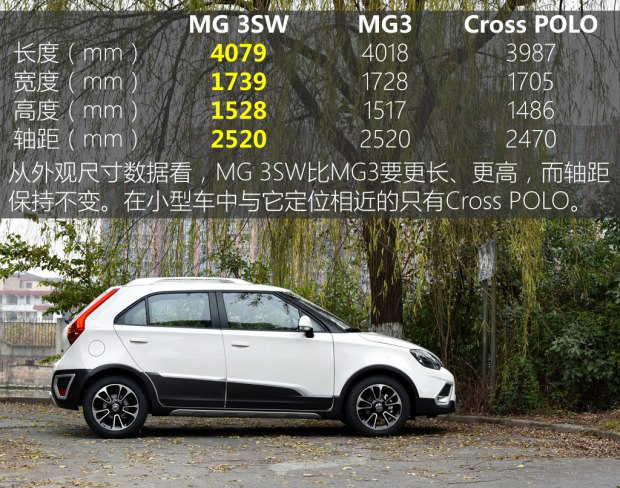MG 3SW長寬高尺寸分別為4079mm×1739mm×1528mm,軸距為2520mm,與MG3 Xross無異。而在小型車序列中,唯一還在堅持走跨界路線的似乎只有Cross POLO一款車了,不過它的體型相比MG 3SW來說還是要小一些。色彩搭配上,原先Xross車型上的8種車身顏色減到了4種,不過對于個人來說還是比較喜歡原先所提供的橙色,至少在視覺上更能給人熱情的感覺。
