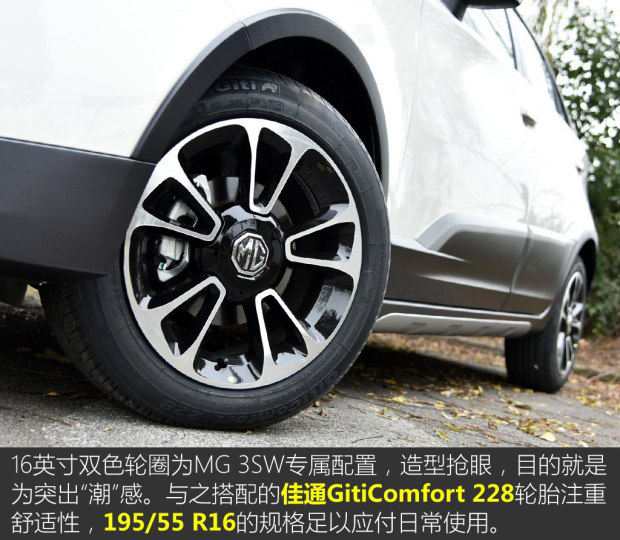 輪胎配置方面,16英寸雙色輪圈是與Xross車型變化最大的地方之一,搭配的佳通輪胎規格為195/55 R16,滿足日常使用足矣。此外,該車配備的是非全尺寸備胎,備胎規格為185/70 R14,應急情況下使用一段時間基本不成問題。MG 3SW的制動系統依然采用同級別主流的前通風盤+后鼓式的組合,制動力表現也能夠讓人滿意。