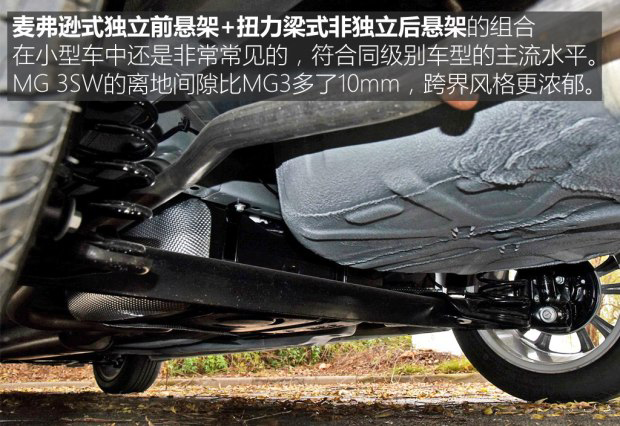 前輪驅動的MG 3SW前后懸架分別為麥弗遜式獨立懸架和扭力梁式非獨立懸架,懸架組合與同價位的小型車和小型SUV并沒有什么大的區別。通過改變減振器部件,MG 3SW的滿載離地間隙從MG3的119mm提高到了129mm,與cross風格的車身套件搭配,跨界風格更顯濃郁。