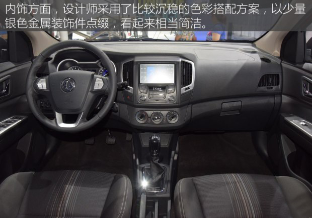 內飾部分,風神AX3車內整體采用了深色的配色,從而營造出了沉穩的內部氛圍。同時,該車中控臺各功能分區清晰合理,從上至下分別為多媒體區、空調控制區以及中控臺儲物格,中控臺整體設計并不花哨,但更加注重實際使用中的實用性。