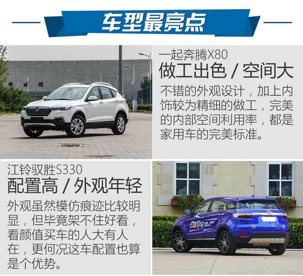 【SUV中國(guó)網(wǎng)】第一次買車,也許你會(huì)要求很多,比如要好看的外觀,配置也想要高的,空間還要大,尤其最后預(yù)算還有限,那下面兩位剛剛上市的兩位對(duì)手你會(huì)比較感興趣。他倆分別是一汽奔騰X80和江鈴馭勝S330,外觀不僅討年輕人喜歡,配置也不俗,主要是空間真的很大,你不信?那你自己來看看嘍。