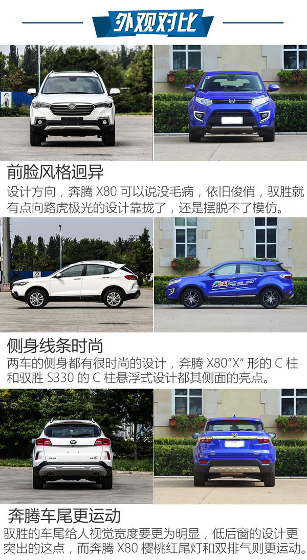設(shè)計(jì)方向,奔騰X80可以說沒毛病,依舊俊俏,馭勝就有點(diǎn)向路虎極光的設(shè)計(jì)靠攏了,還是擺脫不了模仿。兩車的側(cè)身都有很時(shí)尚的設(shè)計(jì),奔騰X80”X“形的C柱和馭勝S330的C柱懸浮式設(shè)計(jì)都其側(cè)面的亮點(diǎn)。馭勝的車尾給人視覺寬度要更為明顯,低后窗的設(shè)計(jì)更突出的這點(diǎn),而奔騰X80櫻桃紅尾燈和雙排氣則更運(yùn)動(dòng)。