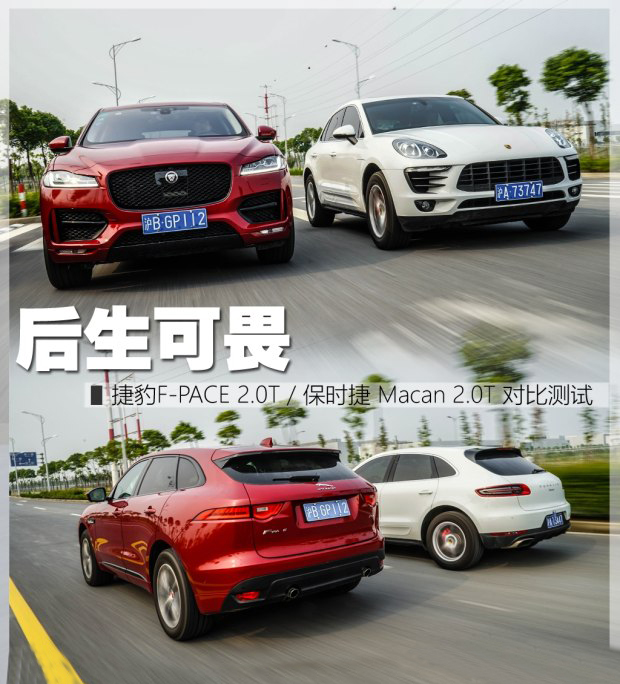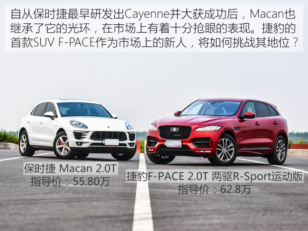 此次我們測試的兩款車型依次為2016款 捷豹F-PACE 2.0T 兩驅(qū)R-Sport運動版、2016款 Macan 2.0T,以下分別簡稱:“F-PACE”、“Macan”。這兩款車的指導(dǎo)價格分別為62.80萬、55.80萬,有著一定的差距,但如果算上市場優(yōu)惠及選裝件的價格,這兩款車的終端售價還是非常接近的。