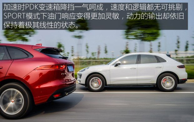 當(dāng)然了,車肯定不只是用來看的,尤其是當(dāng)兩個講究運動的品牌碰擦出火花的時候,后來者就真的只是后來者了。事實證明,Macan把差價都用在了那些看不到的地方,比如全系標(biāo)配的軟硬可調(diào)減振器,又比如全系標(biāo)配的四驅(qū)系統(tǒng),當(dāng)然還有堪稱毫無瑕疵的變速箱和發(fā)動機匹配度。這一切都讓Macan開起來在它這個價位、這個排量上幾乎挑不出瑕疵,并且在性能和舒適兩方面都做到了極致的均衡。相比之下,F(xiàn)-PACE就顯得過于的專一了,英國工程師們似乎一貫的熱衷于向世人展示他們對于機械感和純粹駕駛樂趣的追求,所以F-PACE相比Macan而言,動力輸出要活躍很多,發(fā)動機的噪音也更大一些,懸架系統(tǒng)則保留了更多的路面信息,使其開起來樂趣十足的同時,舒適度上卻著實缺了一些,當(dāng)然了,油耗在已經(jīng)很出色的前提下,相比對手還是高了那么一點點。