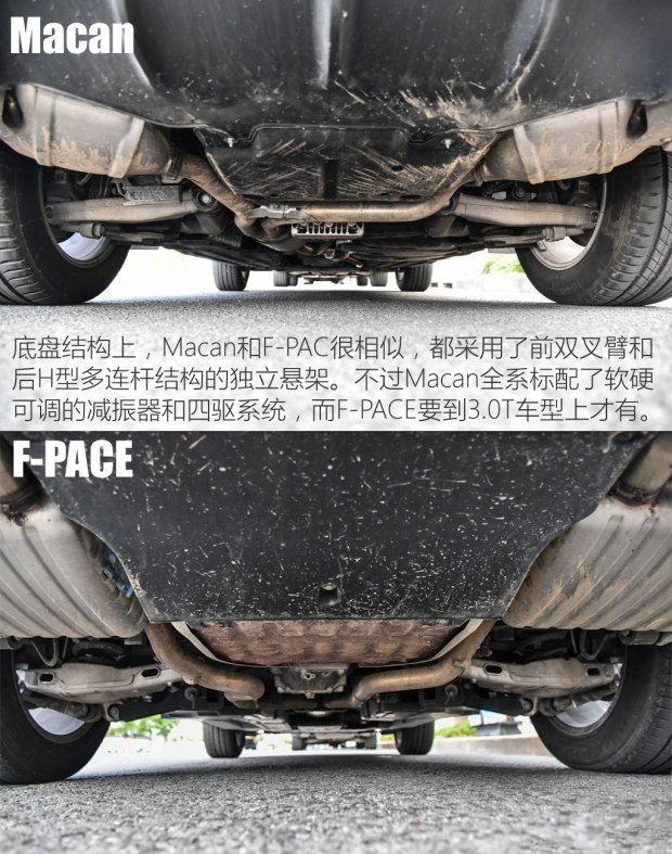 底盤方面,保時捷Macan采用前雙搖臂式獨立懸架,后橋雖然官方名字為“多連桿獨立懸架”,但實際卻是H型梯形連桿式結(jié)構(gòu)。F-PACE的懸架從結(jié)構(gòu)上來看和Macan很相似,同樣前橋為雙叉臂式獨立懸架,后橋為H型整合連桿式懸架。不過,Macan全系標(biāo)配了軟硬可調(diào)的減振器,并且全系標(biāo)配四驅(qū)系統(tǒng),而F-PACE的2.0T車型則只是搭載了普通的減振器,驅(qū)動形式為后驅(qū)。
