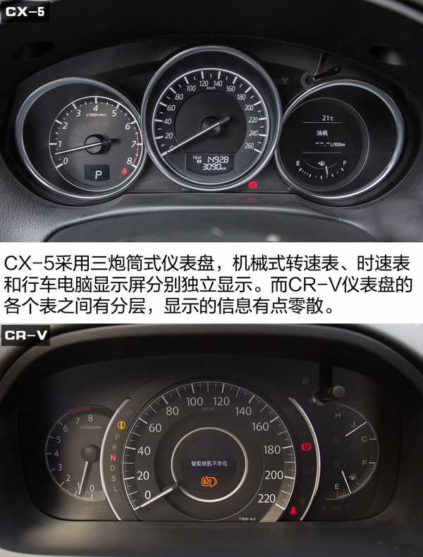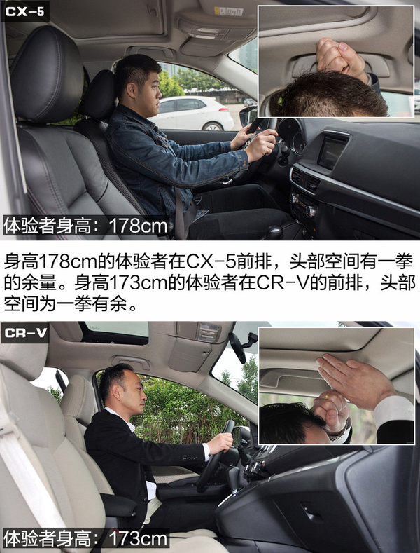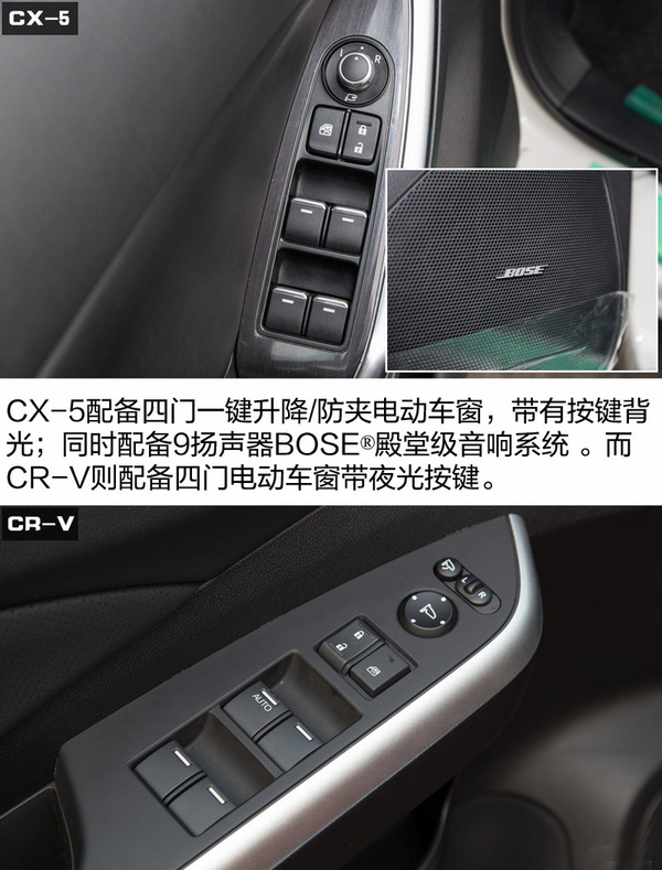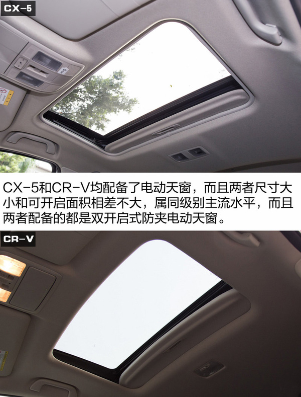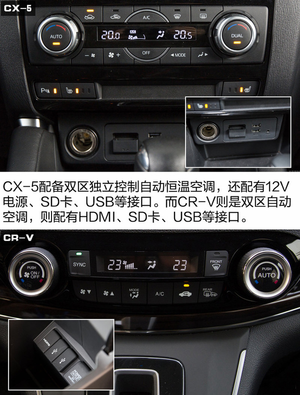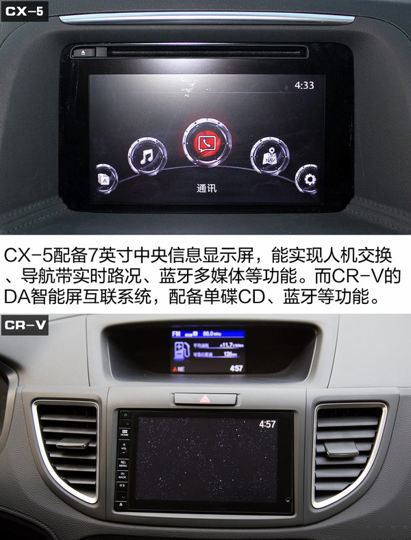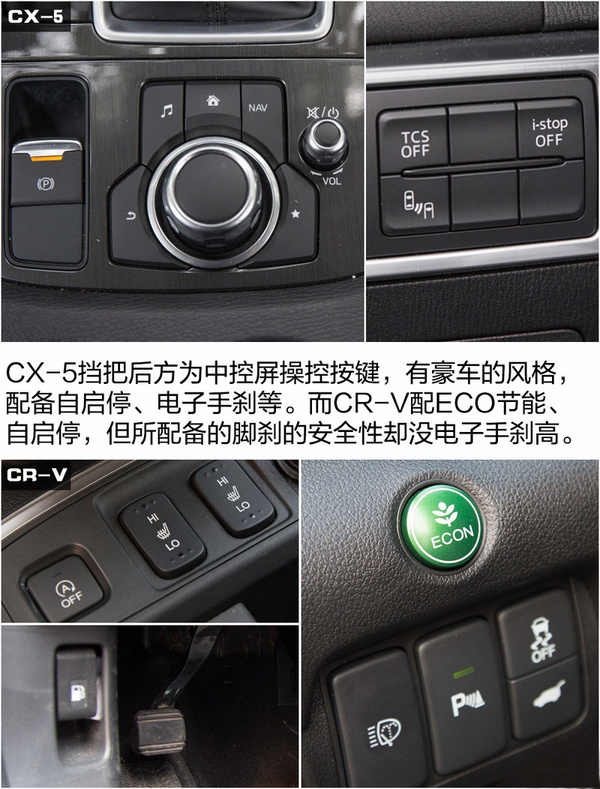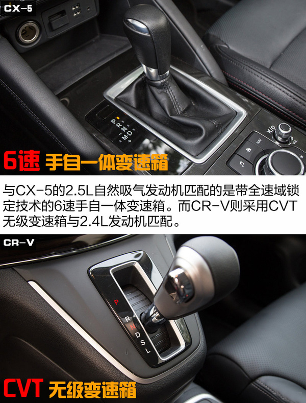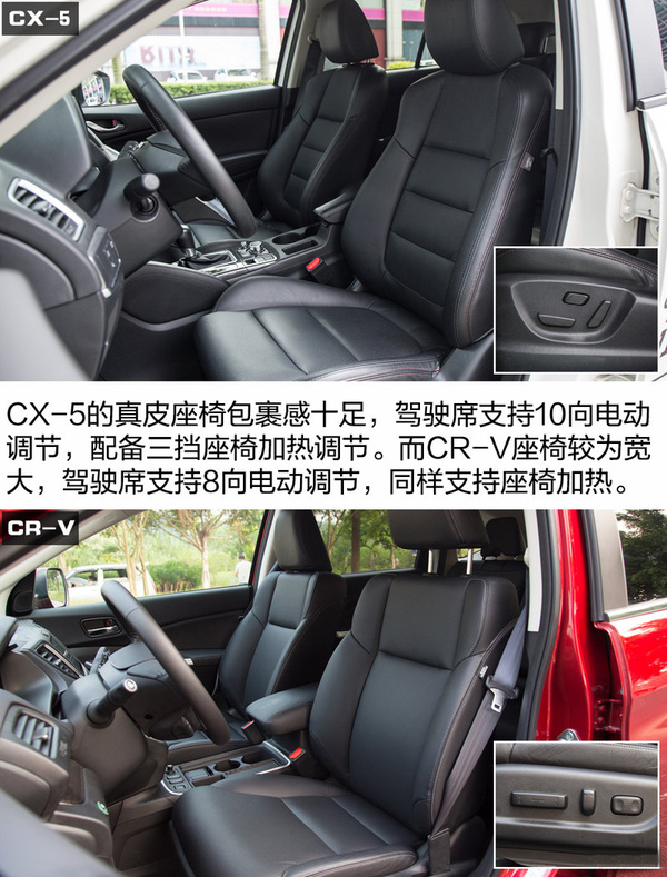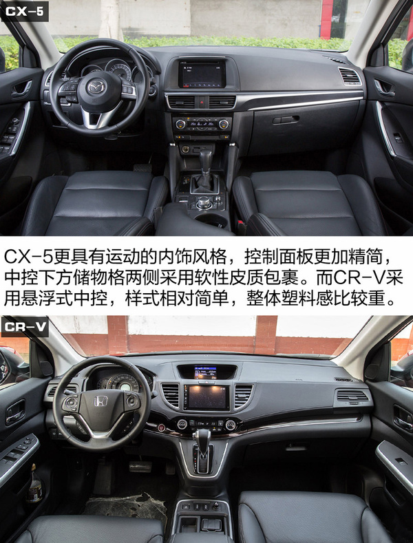 內飾方面,兩者是迥然不同的風格,CX-5在合理人機工程的基礎上更偏向于營造運動氛圍,檔把后方的中控操控區頗有豪車的味道。而CR-V采用懸浮式中控,但樣式較為普通,更加注重實用性。