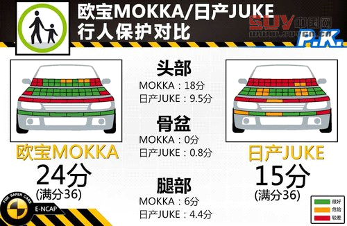 對于行人保護的測試中,日產JUKE僅得到了15分,對于行人的安全保護遠不如同級的歐寶MOKKA,并且按照總成績60%為合格率計算,JUKE并沒有達成,想反MOKKA則在此項目上大幅領先。