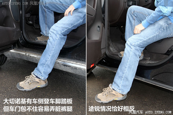 說到車門,兩者在設計上有個明顯的不同,大切諾基有車側腳踏板,因為車身較高,踩在這里更方便上下車。但是,這樣也存在一個問題,那就是車門不能將車側腳踏板包裹在內,而這個部位又是最容易沾染泥點污穢的,所以乘員在上下車時稍不注意就會將褲腿弄臟。途銳則恰好相反,沒有腳踏板登車需要一步進入,但車門將下方完全包裹,不會有弄臟褲腿的困擾。