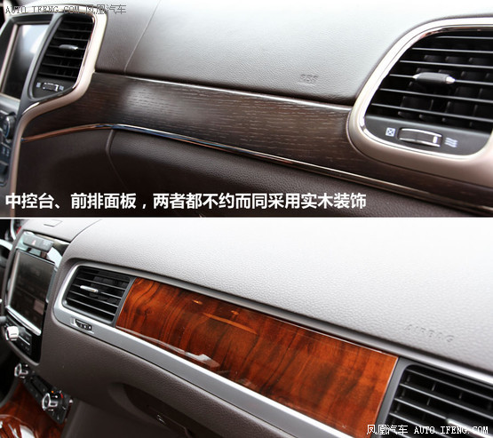 雖然中控臺等處依然有塑料材質的痕跡,但大切諾基用自然色的條紋木飾妝扮,再加上高檔的打孔真皮用細致的雙縫線工藝制程,在3.6L頂配車型上,你還能看見用翻毛絨面材質包裹的側柱和車頂,這些平時不經常被注意的地方,一下升級到新的境界,看上去就高檔,摸起來也非常細膩。途銳的用料也很實在,塑料材質也多為軟性的,中控臺和門板等處也采用了實木的裝飾,但表面是光亮的風格。