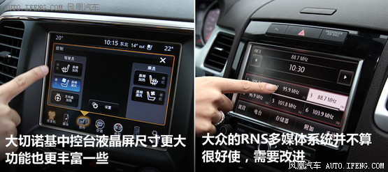 說道中控臺的液晶屏,大切諾基不僅尺寸上比途銳更大一些,而且在具備的功能上也更豐富一些,比如可視倒車就是對手所沒有的;途銳的RNS系列多媒體系統,在操作使用上還需要更人性化一些,這也是大眾車型共同的問題,這套系統是整車上最讓人別扭的系統。由此一來,大切諾基的中控臺臺更顯簡潔,但相對的操作直接性和便利性上,我認為還是大眾的傳統風格更好一些。