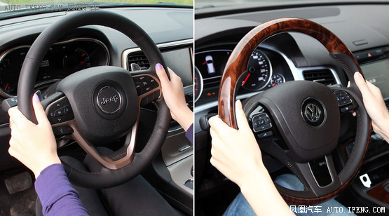 方向盤外徑兩車基本相當,而且也都采用了三輻式的造型,但大切諾基的輪緣要明顯比途銳更粗,一方面可以給人帶來更飽滿的握持感,但另一方面也讓很多手并不大的消費者難以完全握住。在人機工程學方面,途銳要顯得更成熟一些,方向盤握起來感覺更舒服。大切諾基全系都有金屬風格的換擋撥片,而這是對手所沒有的。