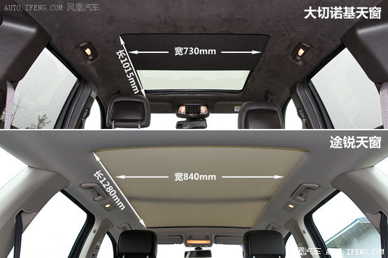 全景天窗是兩者都有的配置,前半段可以向后開啟,既有透光也有通風的作用,比較起來途銳的天窗尺寸要比大切諾基更大一些,從圖片上也能看出。