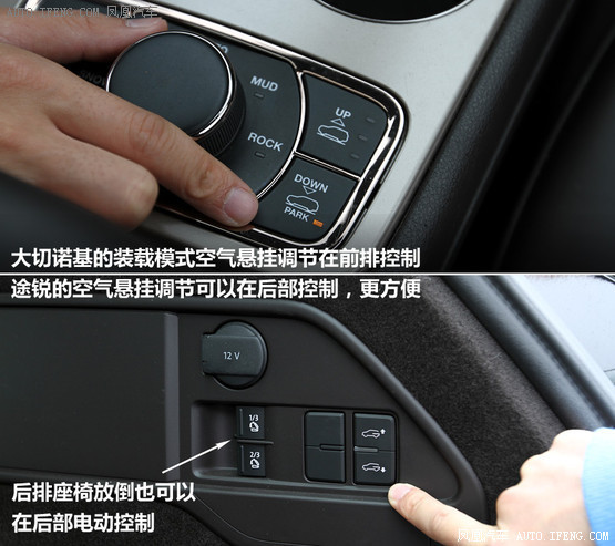 大切諾基在換擋桿后方的空氣懸掛調節處控制,相比之下途銳能夠在車后直接控制,在實際使用時顯得更方便一些,而且在后懸掛降低之后,后備箱開口離地面的高度也是途銳更低一些。但是,大切諾基配置更高,擁有電動尾門,可以用鑰匙遙控或由車內、車尾的按鍵進行控制,而中低配途銳是無此功能的,一些力氣不大女性用戶可能會感到吃力。
