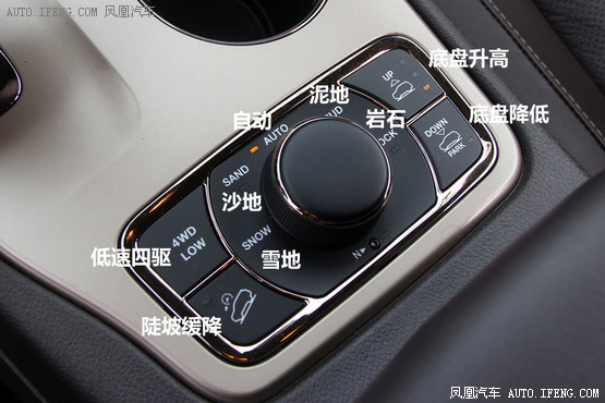 由此可以明顯看出,在四驅系統上大切諾基的越野定位更為專業,而且其配備的Selec-Terrain路況牽引力控制系統,能提供自動、沙地、雪地、泥地和巖石5種模式,相比之下途銳只有:ON ROAD公路和OFF ROAD越野兩種模式,可以說要簡單很多。