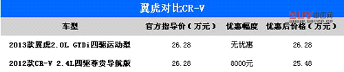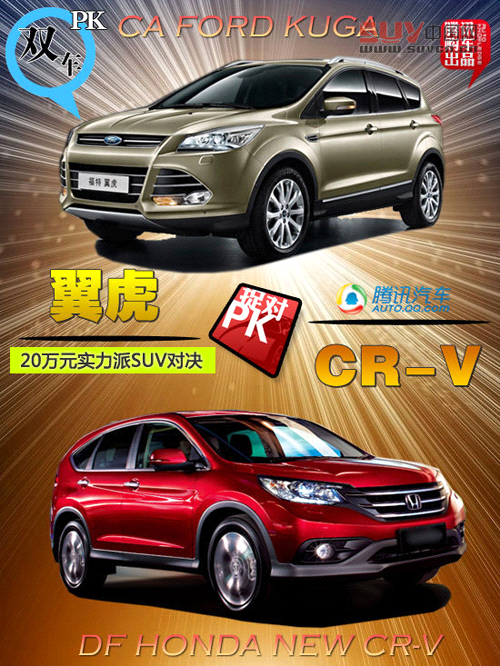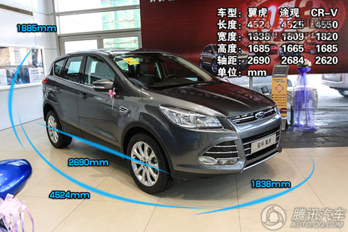 我們選擇了兩款車型中相對具有代表性的車型,福特翼虎2013款 2.0L GTDi四驅運動型,指導價26.28萬元,這是翼虎的次高配車型,頂配車型上一些非常亮眼的高科技配備在運動型上沒有配備,但只出現在頂配車型的功能,很難代表全系車型的配置水平,所以相信這個選擇大家也能接受。本田CR-V則為2012款 2.4L 四驅尊貴導航版,指導價同為26.28萬元,這是本田CR-V的頂配車型,不過該車型比次高配僅僅多帶了導航,在配置上可謂沒多玩把戲。在近期行情方面,CR-V全系車型都可有6000-8000元的優惠,而福特翼虎則沒有任何優惠。