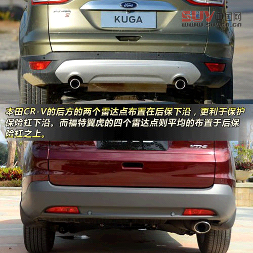 值得一提的是,兩車都配有倒車雷達,但CR-V的雷達布點顯然經過深思熟慮,后方的兩個雷達點布置在后保下沿,而側向的兩個點布置在后保險杠最邊緣的兩個角落;相比之下,福特翼虎的四個雷達點均勻的布置在車尾的保險杠上。看起來CR-V的倒車雷達對于地面上凸起的石墩或者石頭會有更高的敏感度,可以更好的避免倒車時不留神,這些障礙物傷及保險杠下沿。