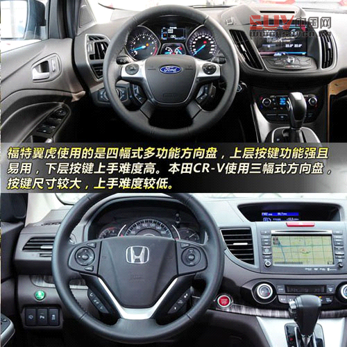 本田CR-V方面,采用的是三幅式方向盤,也使用了多層布局的多功能按鍵設計,其中表面的按鍵設計我們在現款思域上也見到過,讓人聯想起游戲手柄,操作感受也非常不錯。下層按鍵由于設計簡潔而且按鍵尺寸較大,上手難度要低于福特翼虎。