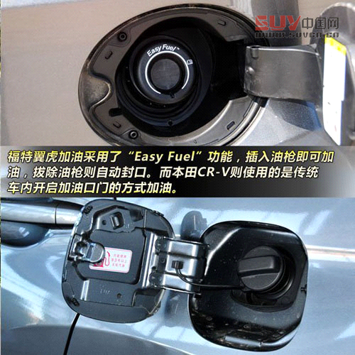 特別的是,福特翼虎加油采用了“Easy Fuel”功能,油箱蓋可以在車外直接開啟,加油的時候只需將油槍插入加油孔即可加油,結束只需拔除油槍,油箱即會自動封口。相比之下,本田CR-V則使用的是比較常見的車內開啟加油孔門和旋鈕式油箱蓋,方便程度不如翼虎,但勝在所有加油站的人都會熟練操作。
